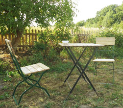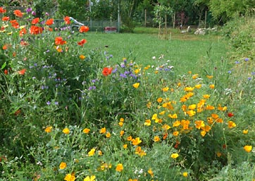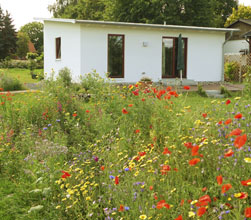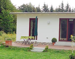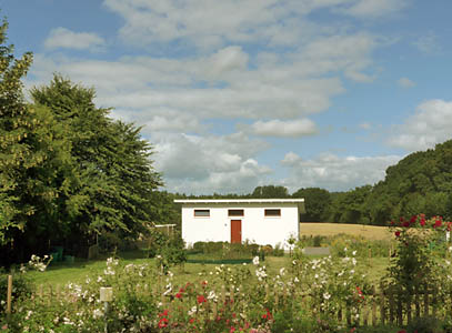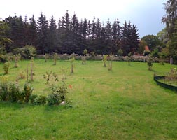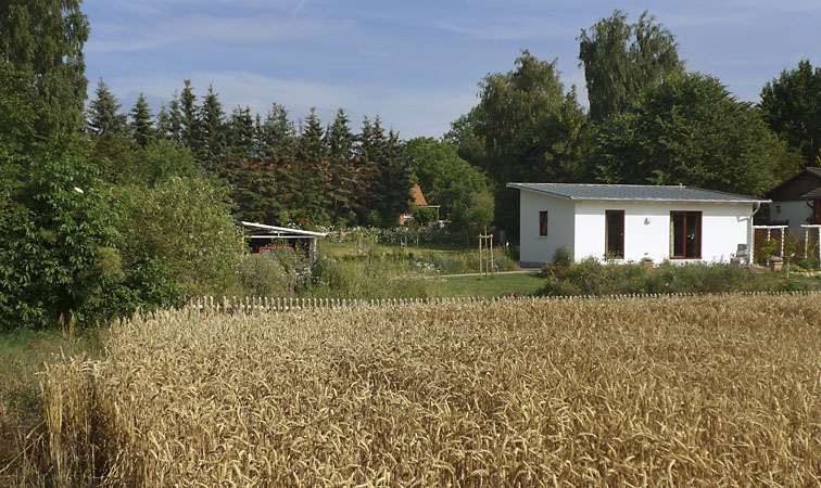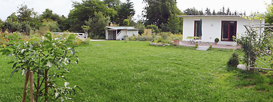 Das kleine Ferienhaus steht in einem großen Gartengrundstück von 2000 qm. Vor dem Haus erstreckt sich eine lange Obstwiese zur Pronstorfer Straße, einer Kommunalstraße mit wenig Durchgangsverkehr. Zur andern Seite grenzt das Grundstück direkt an die Felder und den Wald, den Klingenbrook.