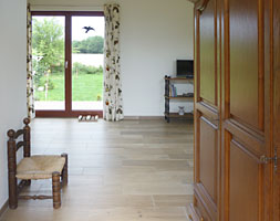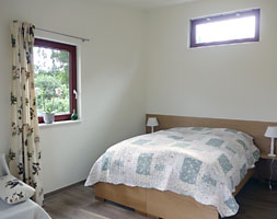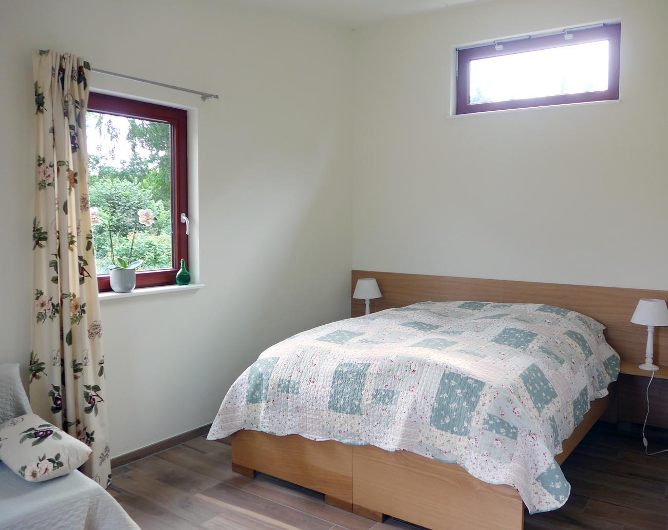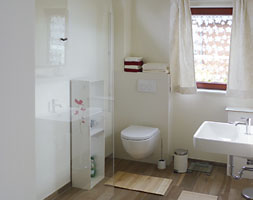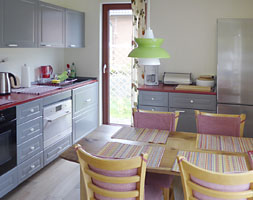 Schlafzimmer mit Doppelbett, Küche mit Herd und Ofen sowie einem Tisch-Ofen (zum Aufbacken und Zubereiten von Tiefkühlkost), Kühlschrank mit Gefrierfächern, Spülmaschine, Kaffeemaschine, Toaster. Tageslichtbad mit bodentiefer Dusche, Haarfön und Waschmaschine. TV und Radio. Aufbettungsmöglichkeit für zusätzlich 1 Erwachsenen oder 2 Kinder bis zu 10 Jahren. Haustiere sind erlaubt.