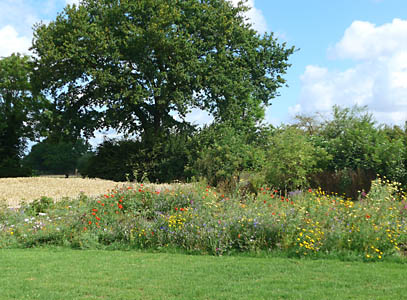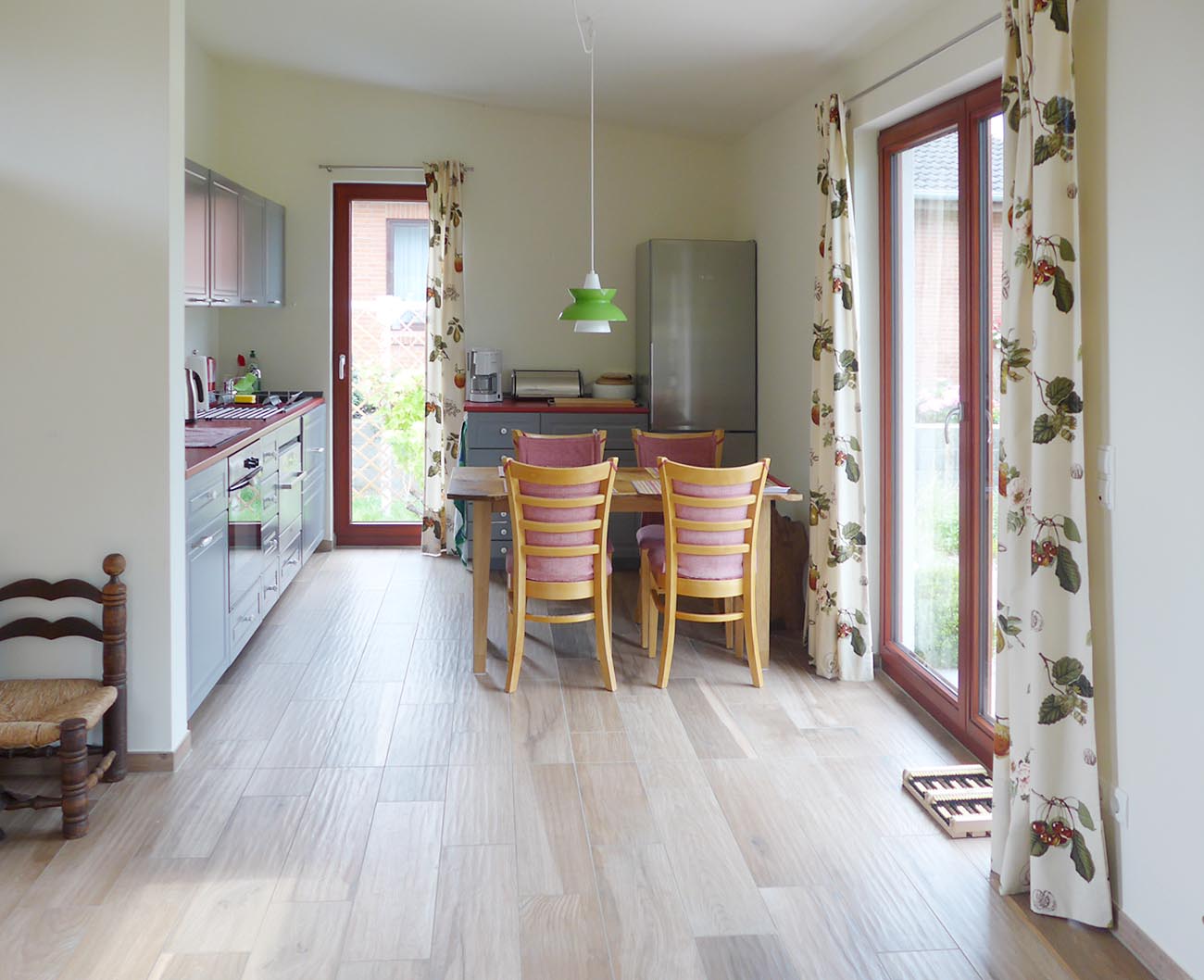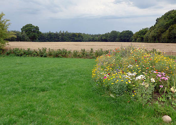 Die großen Fenstertüren gehen nach hinten zum Feld auf eine große Terrasse mit Kräuterbeeten, dahinter eine große Spielwiese, ein Blumenwall und ein Grillplatz – und ein traumhafter Blick über den Klingenbrook. Der Kirchturm der Pronstorfer Kirche lugt malerisch aus der Ferne durch den Knick (wie die Bäume und Büsche am Feldrand hier heißen).