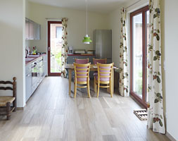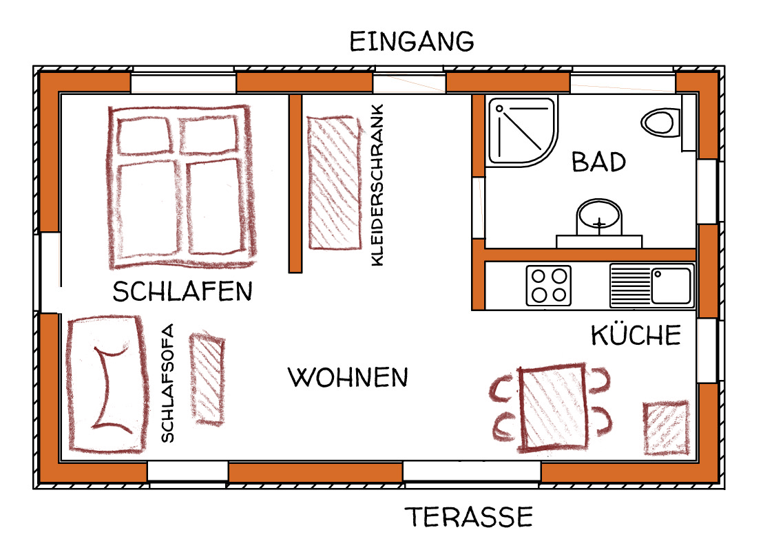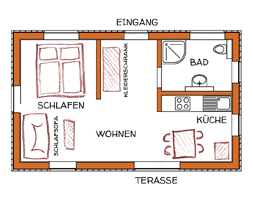 Das Haus hat eine Wohnfläche von 40 qm und über eine offene Küche mit Esstisch, ein ineinander übergehendes Wohn- und Schlafzimmer und ein separates Bad mit bodentiefer Dusche.